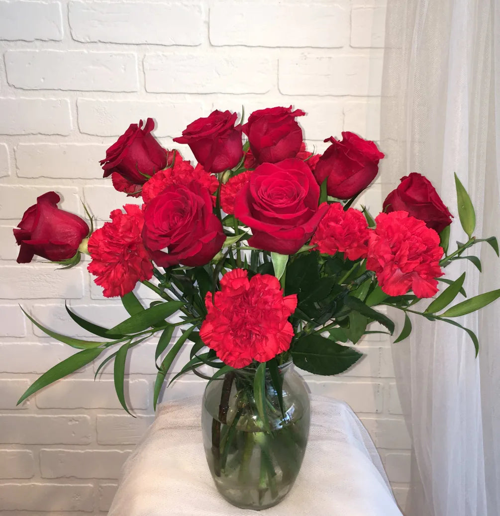Surprise your loved one with a heart full of love with this beautiful vase of deep red roses and carnations. The perfect gift for Valentine's Day, an anniversary or just because.
